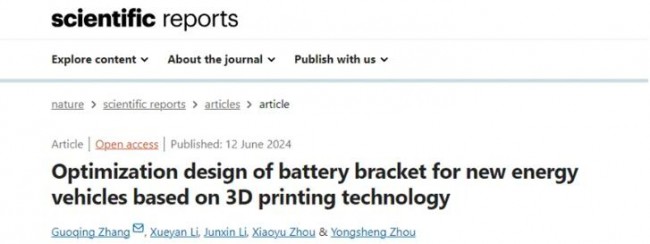 周口師范學(xué)院機(jī)械與電氣工程學(xué)院的張國(guó)慶博士在Scientific reports期刊發(fā)表了《Optimization design of battery bracket for new energy vehicles based on 3D printing technology》,在3D打印技術(shù)助力下,探究了新能源電動(dòng)汽車電池組系統(tǒng)的性能強(qiáng)化潛能。