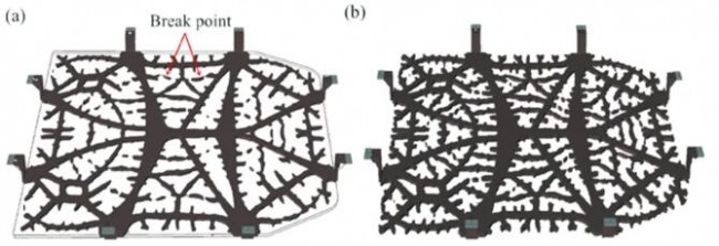 ▲電池托盤拓?fù)鋬?yōu)化結(jié)果:(a)調(diào)整前;(b)調(diào)整后
