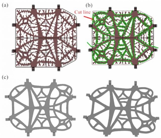 ▲拓?fù)鋬?yōu)化模型的重構(gòu):(a)圖像和模型的導(dǎo)入;(b)切割線的劃分;(c)重構(gòu)效果。