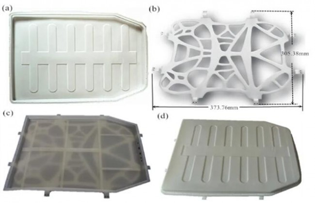 ▲3D打印電池包裝分析:(a)上托盤;(b)下托盤;(c)下托盤支架;(d)整體組裝效果。