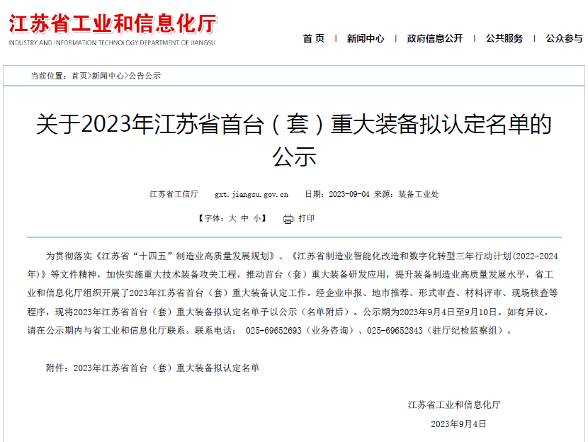 2023年9月4日,江蘇省工信廳對《2023年江蘇省首臺(套)重大裝備擬認定名單》予以公示。中科煜宸的“大型智能激光同步送粉增材制造裝備”被認定為江蘇省首臺套產(chǎn)品。(2018年,中科煜宸LDM8060金屬增材制造裝備獲江蘇省首臺套裝備認定。)
