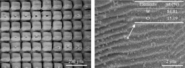 ▲飛秒激光紋理W 的表面形貌:a W 表面和 b 微槽側(cè)壁的 SEM 圖像。c W 表面的 3D 形貌和 d 沿 c 中白線的深度輪廓。