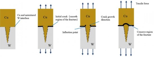 鎢-銅異種金屬斷裂機(jī)理示意圖如圖4所示,縱向拉伸變形時裂紋起源于未激光織構(gòu)化鎢與增材制造銅的接觸表面,加載力增大后,裂紋進(jìn)一步擴(kuò)展至嵌入鎢內(nèi)部的銅,實驗數(shù)據(jù)表明接頭拉伸斷裂強(qiáng)度接近擴(kuò)散焊接鎢-銅接頭。值得注意的是,互鎖接頭力學(xué)性能可以通過優(yōu)化鎢表面結(jié)構(gòu)以及界面銅增材制造工藝獲得進(jìn)一步提升。